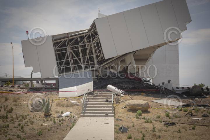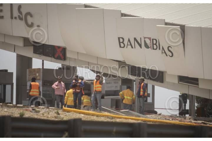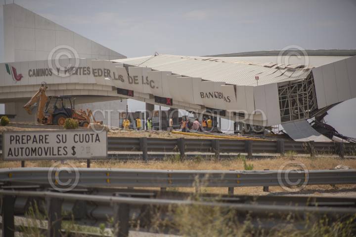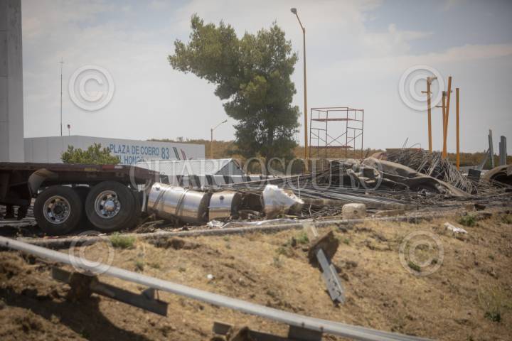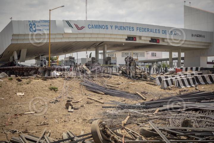 Estructura colapsada tras el choque de un trailer en la Caseta de Caminos y Puentes Federales (Capufe)