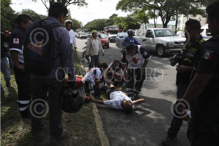 VILLAHERMOSA, TABASCO, 07ENERO2015.- Un joven motociclista que iba conduciendo a exceso de velocidad, se impactó contra un auto en movimiento sobre el bulevar Adolfo Ruiz Cortinez a la altura del fraccionamiento Bonanza. Los socorristas de la benemérita Cruz Roja prestan los primeros auxilios al conductor que resulto con diversas fracturas y lesiones que ponen en riesgo su vida. FOTO: MARCO POLO GUZMÁN HERNÁNDEZ /CUARTOSCURO.COM