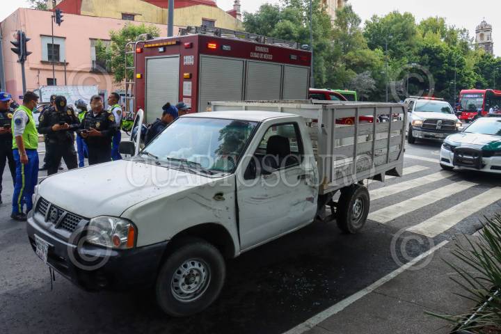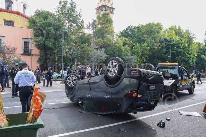 CIUDAD DE MÉXICO, 20JUNIO2024.- Un auto volteado y una mujer herida fue el saldo de un coche entre el coche afectado y una camioneta que circulaba en el carril exclusivo del Metrobus. Los hechos en avenida Hidalgo y Valerio Trujano, colonia centro. Bomberos capitalinos trabajaron en la incorporación de la unidad y limpiar la zona. FOTO: ROGELIO MORALES/CUARTOSCURO.COM