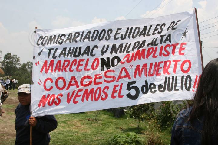 MÉXICO, D.F., 29MAYO2009.- Comisarios ejidatales de Tlahuac y Milpalta se manifestraron com mantas en contra de Marcelo Ebarad jefe de gobiero capitalino durante un evento donde entregó hoy totalmente rehabilitado a productores el huerto de los olivos Santa María Virgen de la Soledad, del Pueblo San Juan Ixtayopan, en la delegación Tláhuac, esto con el propósito de fomentar la producción y venta de la aceituna en la ciudad de México. FOTO: RICARDO CASTELAN/CUARTOSCURO.COM