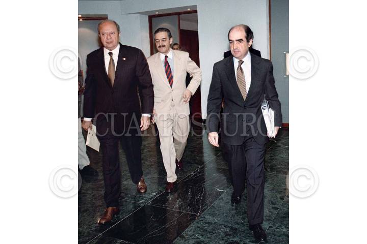 Los legisladores Carlos Romero Deschamps y Rodolfo Becerril acompañan al secretario Luis Tellez, quien esta mañana se reunió con la Comisón de Energía de la Cámara Alta para explicar temas del horario de verano y el aumento en la producción del petróleo.