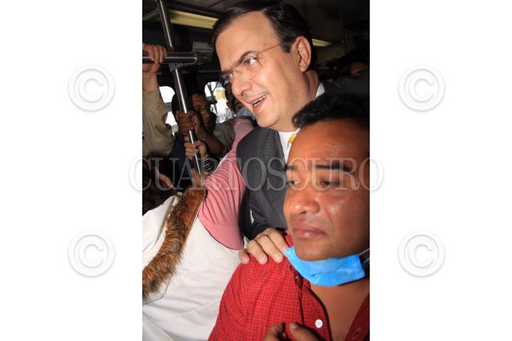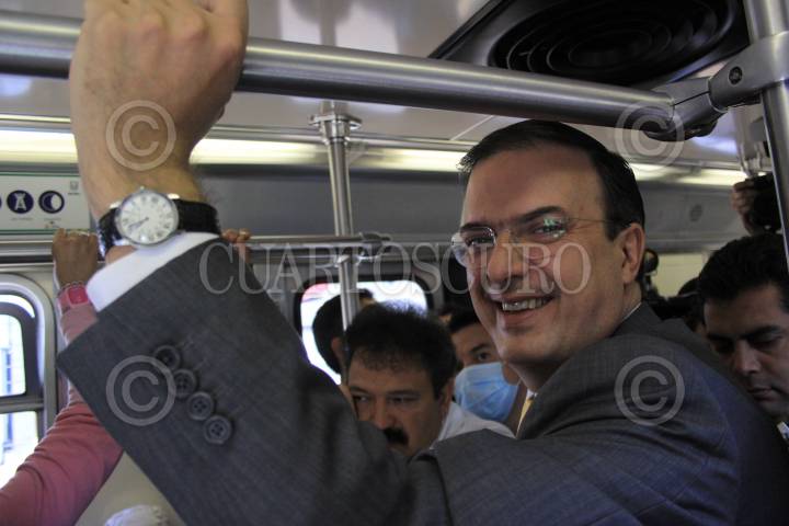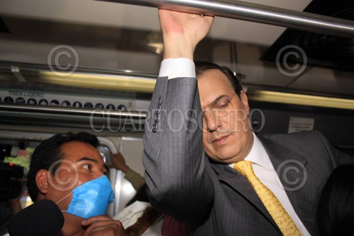 MÉXICO D.F., 25ABRIL2009.- El jefe de Gobierno Marcelo Ebrard, se traslado en tren ligero hacia la estación Xochimilco, en el recorrido el mandatario capitalino repartio cubre bocas a los usuarios y los aconsejo sobre las medidas preventivas ante el brote epidemiologico de virus porcino FOTO: SÁSHENKA GUTIÉRREZ/CUARTOSCURO.COM