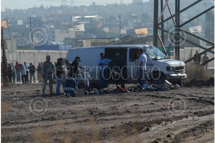 TIJUANA, BAJA CALIFORNIA 30NOVIEMBRE2008.- Nueve personas ejecutadas, siete de ellas decapitadas, fueron encontradas en meido de un camellón de la arteria que va al fraccionamiento Sierra Bella de la colonia Jardín Dorado de la zona Este de Tijuana. Las cabezas están a un lado de los cuerpos. En estos momentos el lugar está acordonado por militares y el agente del Ministerio Público hace su trabajo. Los cuerpos están siendo levantados. Son siete decapitados y dos completos. Extraoficialmente se informó que entre los nueve ejecutados, hay tres policías municipales levantados ayer. FOTO: EL MEXICANO/CUARTOSCURO.COM