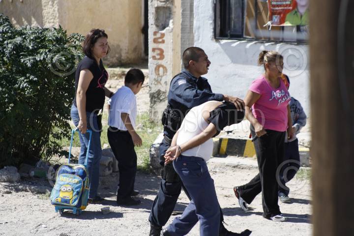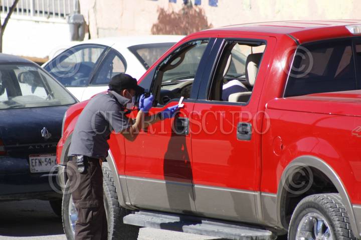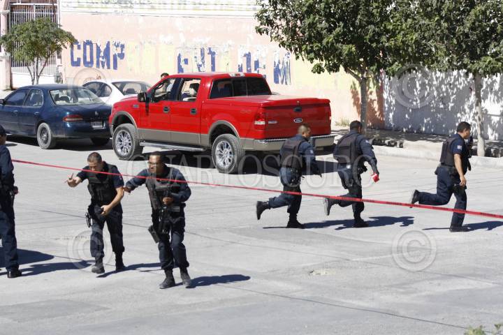 CIUDAD JUÁREZ, CHIHUAHUA, 01OCTUBRE2013.- Una pareja que esperaba a que salieran los niños de una escuela particular fueron emboscados por hombres armados en la colonia Aztecas. El hecho delictivo ocurrió en el cruce de las calles Tarascos y Tetzalez, donde sicarios se acercaron a la pick up Lobo de reciente modelo que tripulaban los padres que esperaban a que salieran de la escuela Instituto Vicentino, cuando los gatilleros dispararon a corta distancia. El conductor de aproximadamente 35 años de edad, perdió la vida, mientras que la mujer resultó lesionada por arma de fuego muriendo mas tarde en el hospital. Al lugar llegaron de inmediato agentes municipales y capturaron a tres de los presuntos responsables del asesinato, sin embargo no han sido reveladas las identidades de los detenidos. FOTO: NACHO RUIZ /CUARTOSCURO.COM