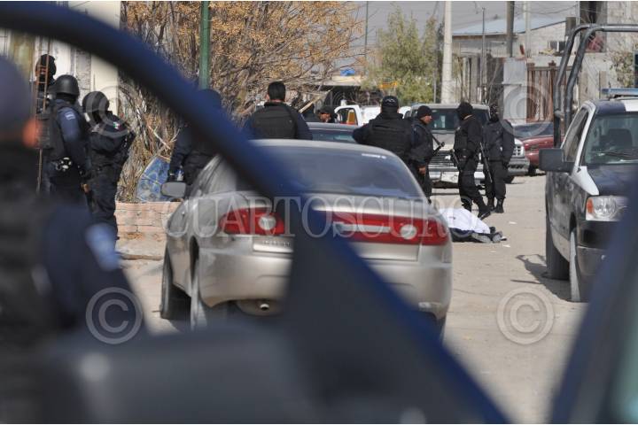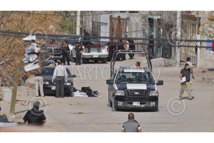 CIUDAD JUAREZ, CHIHUAHUA, 04DICEIMBRE2010.- Cuatro 4 agentes de la Policía Municipal fueron acribillados esta tarde. El ataque se registró a la una de la tarde del dia, en el cruce de las calles Acamapiztle y Cuauhtlatoatzin en la colonia Águilas de Zaragoza. Se dijo que los agentes fueron emboscados cuando viajaban en la unidad 371, realizando patrullajes por el sector en mención. En el lugar de los hechos quedaron los cuerpo de los cuatro agentes, uno más quedó gravemente herido, además se informó que varios civiles inocentes fueron alcanzados por balas perdidas. FOTO: NACHO RUIZ/CUARTOSCURO.COM
