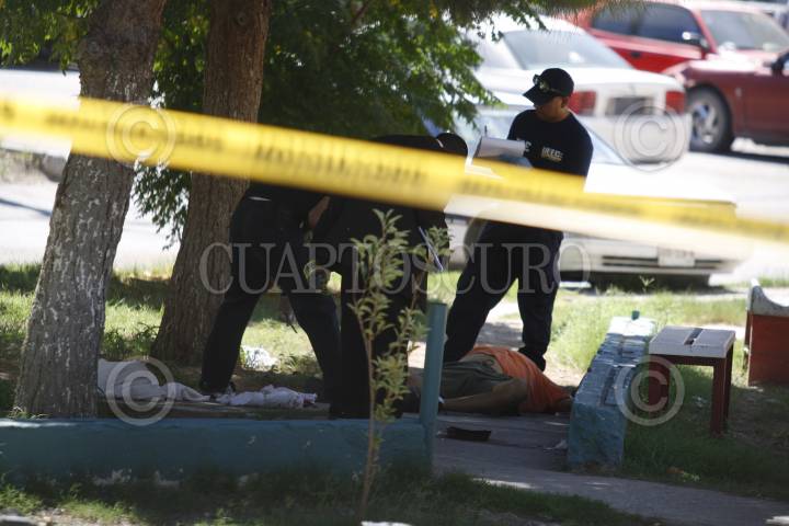 CIUDAD JUÁREZ, CHIHUAHUA, 01SEPTIEMBRE2014.- Dos personas fueron acribilladas cuando caminaban por el parque que se ubica sobre la calle Insurgentes a la altura de la calle Juan de Dios Olivas por un grupo de hombres armados que les dispararon a quemarropa desde un automóvil en movimiento. De acuerdo a los testigos del hecho, los agresores eran 4 hombres que circulaban en un carro color gris, según dieron a conocer a los cuerpos policíacos que arribaron al lugar. Una de las víctimas murió en el lugar, mientras que la segunda resultó con heridas de gravedad y fue trasladado a un nosocomio para su atención. FOTO: NACHO RUIZ /CUARTOSCURO.COM