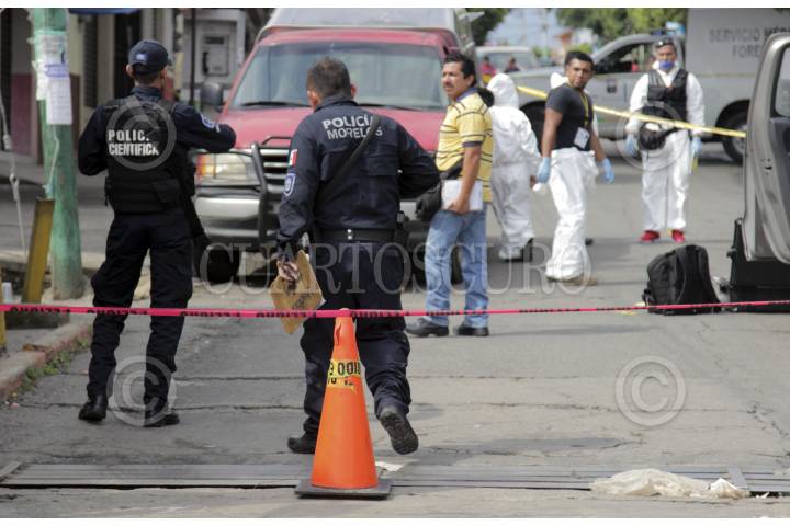 CUERNAVACA, MORELOS, 01JULIO2016.- Dos hombres fueron acribillados a balazos esta tarde en la calle Otilio Montaño de la colonia Antonio Barona. Pasadas las 15:00 horas dos sujetos armados llegaron y abrieron fuego para después darse a la fuga a bordo de un auto compacto, en su huida atropellaron a 3 trabajadores del paso exprés que se encuentran en el hospital. Extraoficialmente se conoció que los agresores fueron detenidos después de un operativo policiaco que se implementó. FOTO: MARGARITO PÉREZ RETANA /CUARTOSCURO.COM