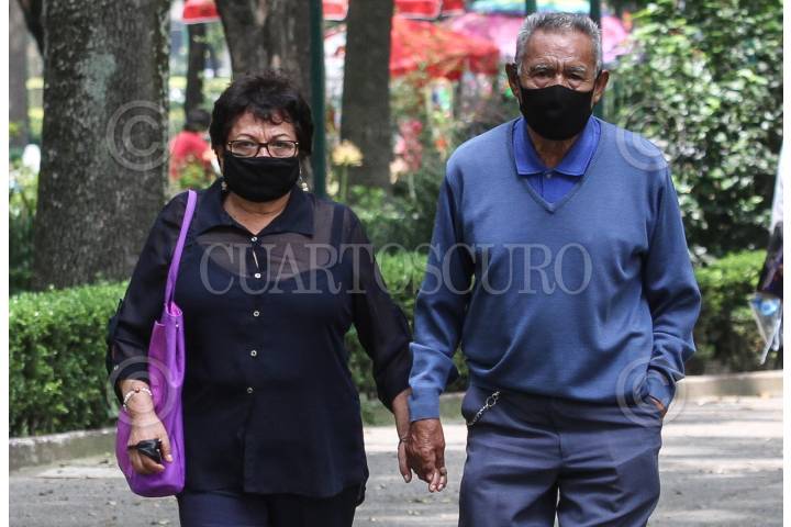 Pareja de adultos mayores camina por el Parque de los Venados ubicado en la alcaldía Benito Juárez.