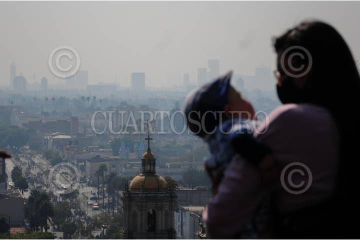 Una madre y su hijo observan la vista desde el cerro de tepeyac.