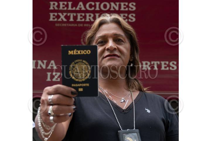 Mahia Michelle, mujer trans, muestra su pasaporte después de se entregado por las autoridades en la Oficina de Pasaportes Iztacalco