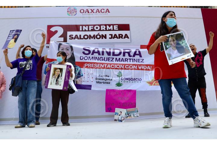 OAXACA, OAXACA, 15NOVIEMBRE2024.- Familiares de la defensora y abogada Ayuujk, Sandra Domínguez Martínez, desparecida junto con su esposo Alexander Hernández Hernández, el pasado 4 de octubre en Maria Lombardo, Oaxaca, protestaron con consignas y fijaron una postura frente al palacio de gobierno de Oaxaca en torno al segundo informe del gobernador morenista, Salomón Jara Cruz. Las personas, que cumplieron 9 días de plantón en el acceso principal del recinto, exigieron a las autoridades la presentación con vida de la activista, además de denunciar que cada día crece el número de desaparecidas y desaparecidos en el estado. FOTO CAROLINA JIMÉNEZ/CUARTOSCURO.COM