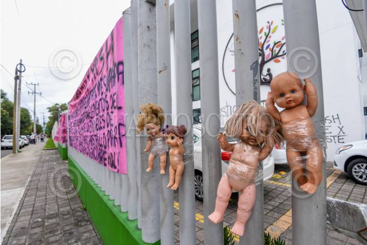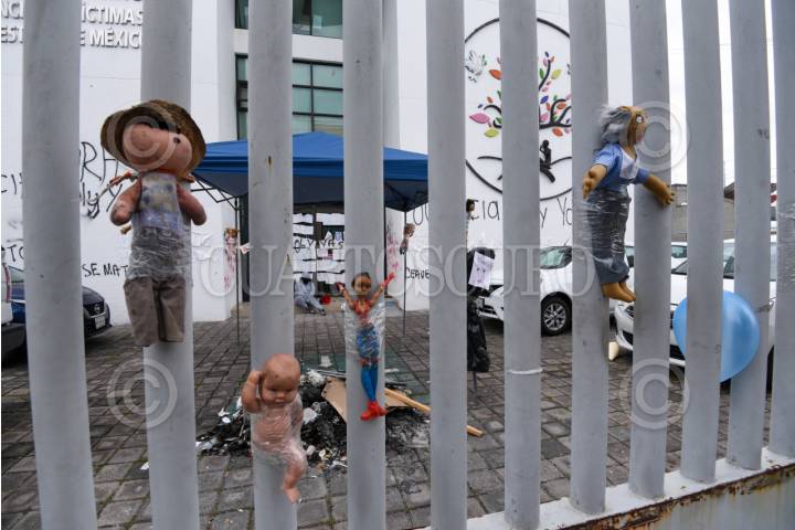 METEPEC, ESTADO DE MÉXICO, 31JULIO2025.- Com muñecas en las rejas del CEAVEM la mamá de Holy Yash, pide ser ingresada al registro estatal de víctimas tiene desde hace una semana tomadas las instalaciones de la Comisión Ejecutiva de Atención a Víctimas del Estado de México en Metepec. FOTO: CRISANTA ESPINOSA AGUILAR/CUARTOSCURO.COM