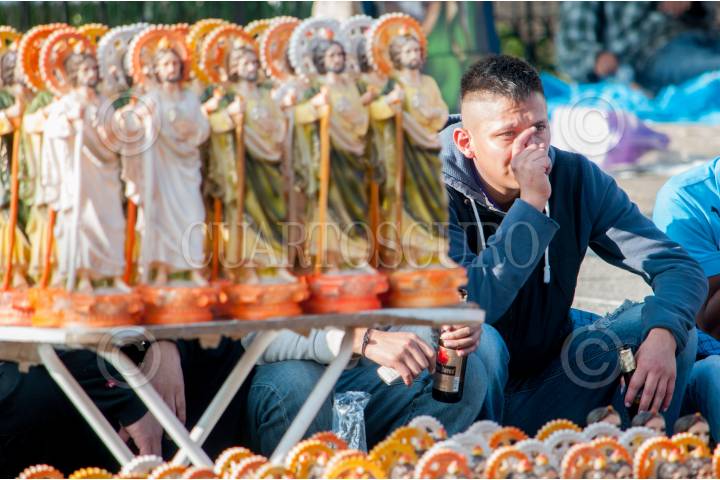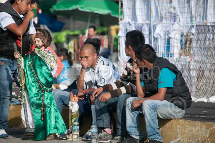 MÉXICO, D.F., 28SEPTIEMBRE2013.- Jóvenes inhalan solventes, mejor conocido como "mona" durante la celebración a San Judas Tadeo. Miles de fieles a San Judas Tadeo se congregan en el Templo de San Hipólito para celebrar al santo conocido como “el de las causas difíciles”. La mayoría de la gente lleva imágenes o figuras de San Judas para poder bendecirlas y así poder agradecer un favor conseguido o pedir uno nuevo. FOTO: DIEGO SIMÓN SÁNCHEZ / CUARTOSCURO.COM
