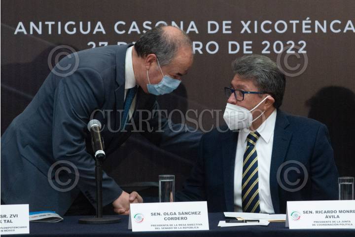 Zvi Itzhak Tal, embajador del Estado de Israel en México, y Ricardo Monreal, senador y coordinador de Morena, durante el "Acto de Conmemoración Anual en Memoria de las Víctimas del Holocausto y en Recuerdo de Don Gilberto Bosques Saldívar", realizado en la Antigua Casona de Xicoténcatl.