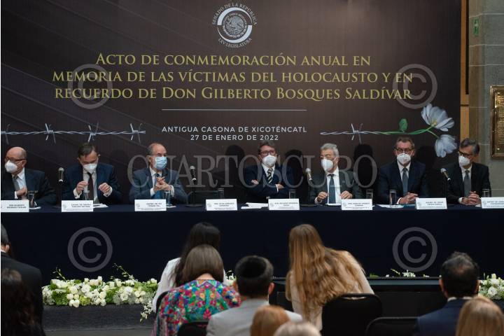 Gilberto Bosques Tistler; Maciej Tadeusz Zietara, embajador de la República de Polonia en México; Zvi Itzhak Tal, embajador del Estado de Israel en México; Ricardo Monreal, senador y coordinador de Morena; Marcos Shabot Zonana, presidente del Comité Central de la Comunidad Judía; Heinz Peter Tempre, embajador de la Alemania en México, y Jean-Pierre Asvazadourian, embajador de Francia en México, encabezaron el "Acto de Conmemoración Anual en Memoria de las Víctimas del Holocausto y en Recuerdo de Don Gilberto Bosques Saldívar", realizado en la Antigua Casona de Xicoténcatl.