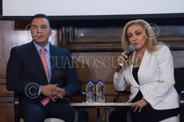 CIUDAD DE MÉXICO, 18JULIO2019.- Alberto Santini, director de Azul Siete y Laura Lucio, escritora, durante la conferencia de prensa donde se presentó el nuevo documental de la cantante Jenni Rivera, en la Hacienda de los Morales. FOTO: ROGELIOMORALES /CUARTOSCURO.COM