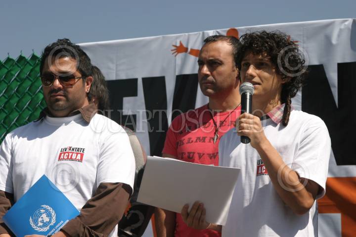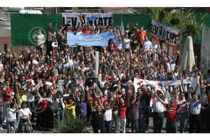 MÉXICO D.F., 16OCTUBRE2009.- Decenas de personas se dieron cita en la terraza de las instalaciones de la sede de la ONU como parte de la iniciativa mundial "Levántate Actúa, Contra la Pobreza y por los Objetivos de Desarrollo del Milenio", al mismo tiempo en todo el mundo personas de todas las nacionalidades se sumaban a esta manifestación pacifica. FOTO: MOISÉS PABLO/CUARTOSCURO.COM