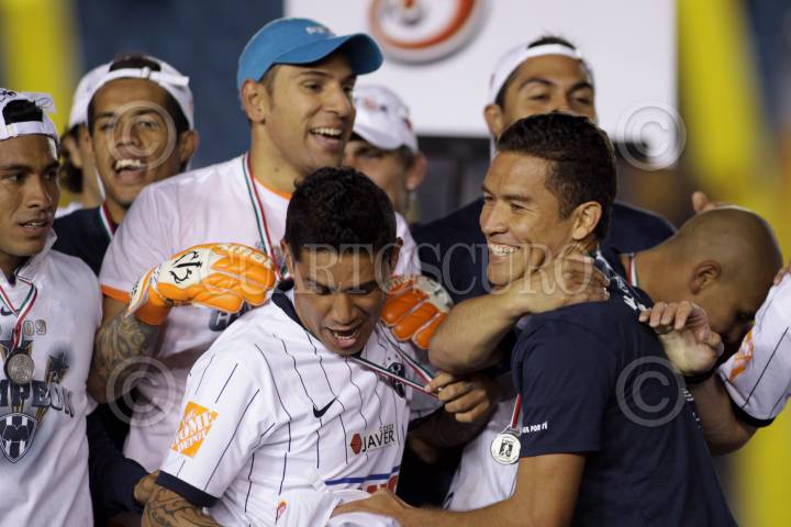 MÉXICO, D.F., 13DICIEMBRE2009.- Jonathan Orozco, Jesus Arellano, Gerardo Galindo, jugadores de los Rayados del Monterrey, que se coronaron campeón del Torneo de Apertura 2009, festejan su triunfo sobre la Máquina Cementera en el estadio Azul con un marcador global de 6-4. FOTO: SÁSHENKA GUTIÉRREZ/CUARTOSCURO.COM