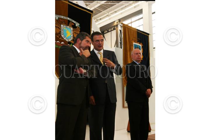 MÉXICO, 18MAYO2010.- Juan Ramón de la Fuente, ex rector de la Máxima Casa de Estudio conversa con Marcelo Ebrard, Jefe de Gobierno, al fondo los observa José Narro Robles, rector de la Universidad Nacional Autónoma de México, durante la ceremonia de reapertura del Museo del Chopo. FOTO: LEONARDO CASAS/CUARTOSCURO.COM