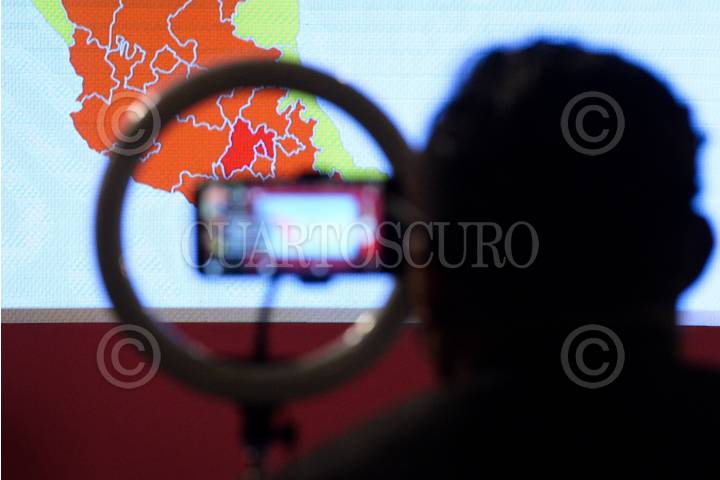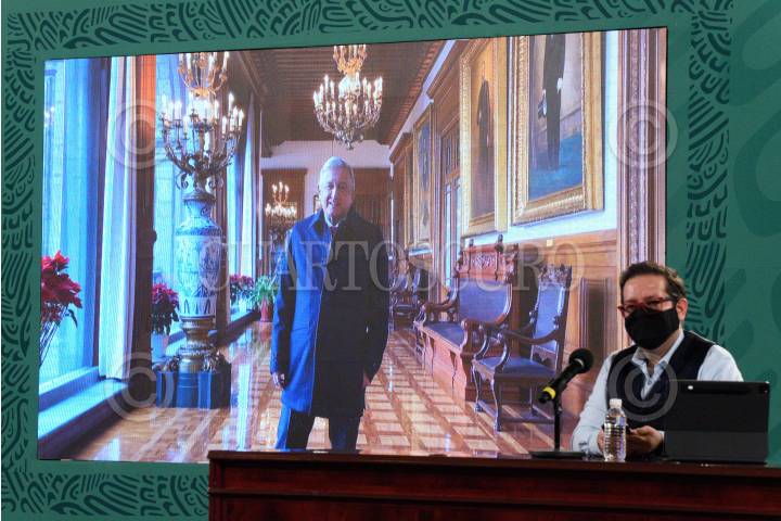 Ricardo Cortés Alcalá, titular de la Dirección General de Promoción de la Salud, durante la proyección del video en donde aparece Andrés Manuel López Obrador, presidente de México, en el cual informó sobre su estado de salud estable luego de contraer covid-19.