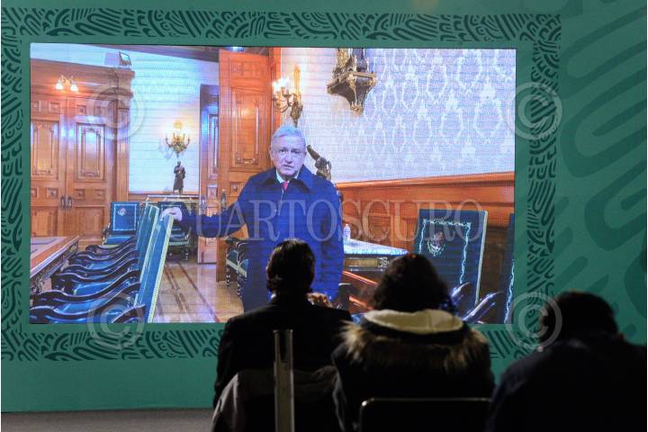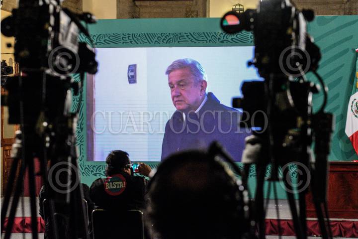 Medios de comunicación observan la proyección del video en donde aparece Andrés Manuel López Obrador, presidente de México, en el cual informó sobre su estado de salud estable luego de contraer covid-19.