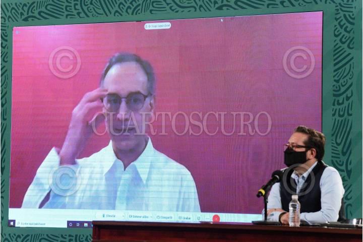 Hugo López-Gatell Ramírez, subsecretario de Prevención y Promoción de la Salud, mediante videoconferencia y Ricardo Cortés Alcalá, titular de la Dirección General de Promoción de la Salud, durante el informe diario sobre la pandemia por covid-19 y el avance de la estrategia nacional de vacunación contra SARS-CoV-2.