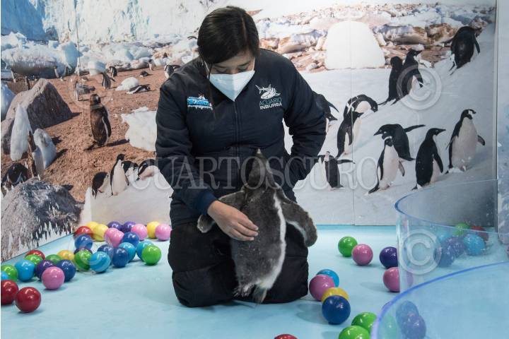 "Alex" el pingüino, primera cría de pingüino antártico nacida en México, en el Acuario Ibursa, el cual fue reabierto siguiendo todos los protocolos sanitarios para evitar la transmisión de covid-19.