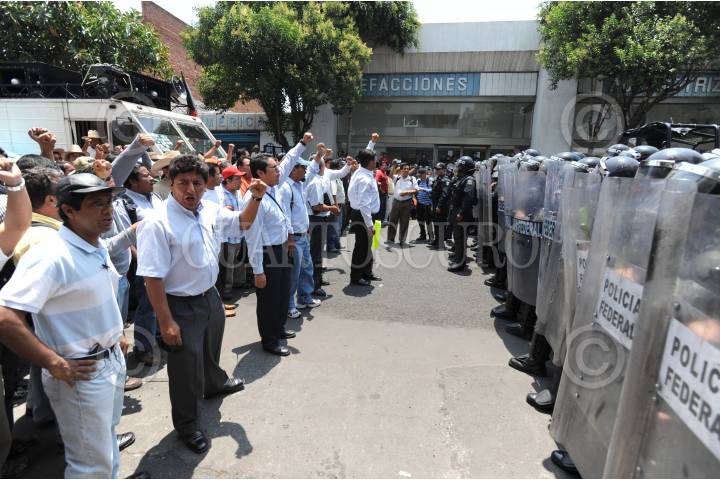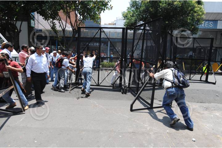 MÉXICO D.F., 12JUNIO2009.- Maestros de distintas entidades del país, en el Distrito Federal, marcharon esta tarde donde acudieron a diversas dependencias tales como el Senado de la República alas oficinas del ISSSTE, Televisa y Secretaria de Gobernación en donde derribaron las ballas que colocaron elementos de la policía Federal para resguardar el lugar sobre la calle Abraham Gonzalez. FOTO:LUIS CARBAYO/CUARTOSCURO.COM