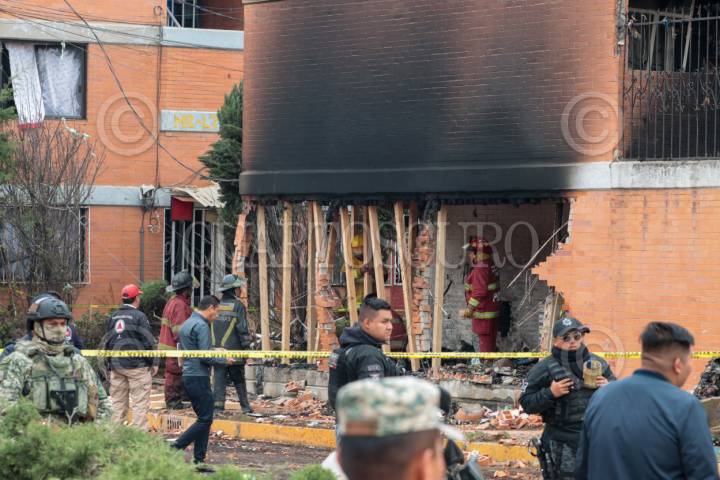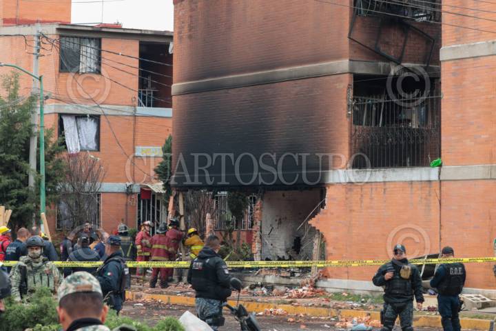 LOS REYES LA PAZ, ESTADO DE MÉXICO, 31ENERO2024.- Esta mañana se registró una explosión en un departamento de la Unidad Habitacional Tepozanes, la cual se dio por acumulación de gas, el saldo fue de 10 personas heridas y una mujer muerta de 25 años. FOTO: ROGELIO MORALES/CUARTOSCURO.COM