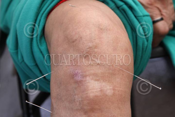 MÉXICO, D.F., 06MARZO2009.- Una mujer de la tercera edad que sufre de un dolor crónico de la articulación de la rodilla se sometió a una sesión de acupuntura durante la Feria Vive Mujer que se realizó en la explanada de la delegación Miguel Hidalgo. FOTO: MOISÉS PABLO/CUARTOSCURO.COM