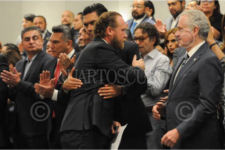 Jorge Romero, diputado del PAN, es abrazado por Santiago Creel al término de su participación.