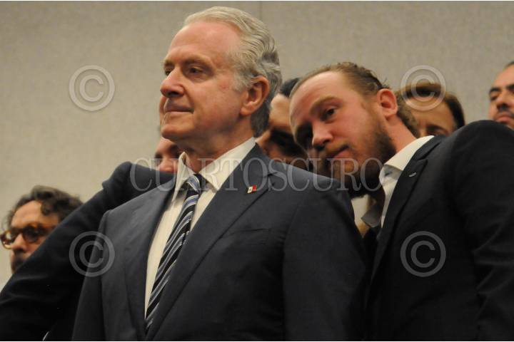 Santiago Taboada y Jorge Romero, dialogan a espaldas de Santiago Creel, durante el evento.