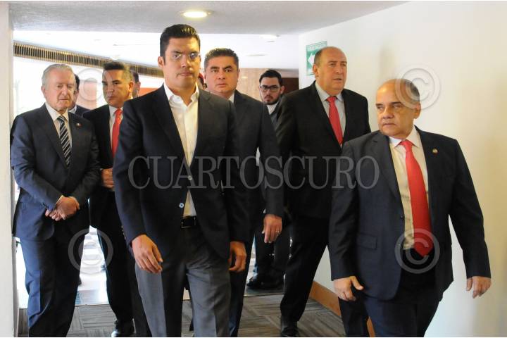 Jorge Romero, coordinador de la bancada del PAN en Diputados, dialoga con los líderes del PRI, PRD y PAN precio a la conferencia.