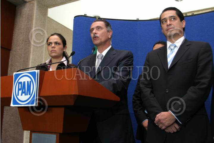MÉXICO, D.F., 27ENERO2007.- María Gómez del Campo, candidata a la presidencia del PANDF, Carlos Abascal, secretario adjunto del Cómite Nacional del PAN y Carlos Gelista, actual presidente del PAN y también aspirante, ofrecieron una conferencia de prensa en la sede nacional, para hablar sobre el proceso interno que se realizará el día de mañana. FOTO: MOISÉS PABLO/CUARTOSCURO.COM