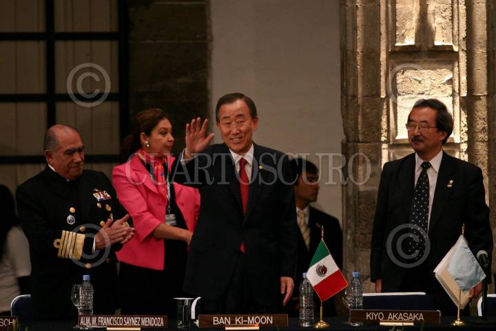 MÉXICO, D.F., 09SEPTIEMBRE2009.- Francisco Saynez Mendoza, secretario de Marina; Ban Ki-Moon, secretario general de la Organización de las Naciones Unidas (ONU) y Kiyo Akasaka, subsecretario general adjunto del Departamento de Información Pública de la ONU a su llegada a la 62 Conferencia Anual de Información Pública de la ONU y las Organizaciones No Gubernamentales (DIP/ONG) “¡Desarme ahora! Trabajemos por la paz y el desarrollo” que se realizo en el ex Convento de San Hipolito. FOTO: RODOLFO ANGULO/CUARTOSCURO.COM
