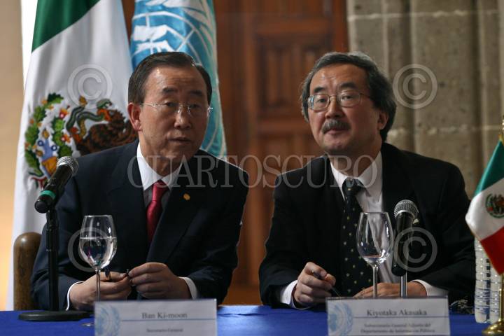 MÉXICO, D.F., 09SEPTIEMBRE2009.- Ban Ki-Moon, secretario general de la Organización de las Naciones Unidas (ONU) y Kiyo Akasaka, subsecretario general adjunto del Departamento de Información Pública de la ONU, ofrecieron una conferencia de prensa al termino de su participación en la 62 Conferencia Anual de Información Pública de la ONU y las Organizaciones No Gubernamentales (DIP/ONG) “¡Desarme ahora! Trabajemos por la paz y el desarrollo” que se realizo en el ex Convento de San Hipolito. FOTO: RODOLFO ANGULO/CUARTOSCURO.COM