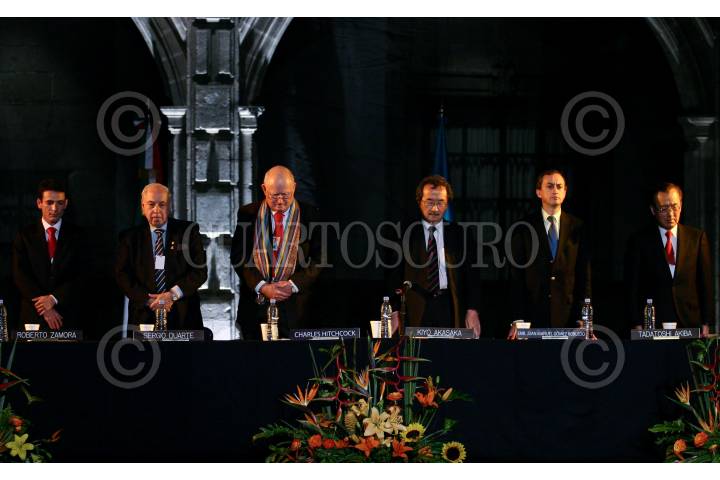 MÉXICO, D.F., 11SEPTIEMBRE2009.- Roberto Zamora, abogado y miembro de Global Partnership for the Prevention of Armed Conflict; Sergio Duarte, Alto Representante para Asuntos de Desarme de las Naciones Unidas; Charles Hitchcock, presidente de la 62ª Conferencia Anual DIP/NGO; Kiyo Akasaka, subsecretario general adjunto del Departamento de Información Pública de la ONU; el embajador Juan Manuel Gomez; y Tadatoshi Akiba, alcalde de la ciudad de Hiroshima, Japón guardan un minuto de silencio por las victimas del 11 de septiembre durante la ceremonia de clausura de la 62 Conferencia Anual de Información Pública de la ONU y las Organizaciones No Gubernamentales (DIP/ONG) “¡Desarme ahora! Trabajemos por la paz y el desarrollo” que se realizo en el ex Convento de San Hipolito. FOTO: RODOLFO ANGULO/CUARTOSCURO.COM