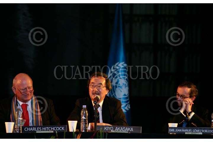 MÉXICO, D.F., 11SEPTIEMBRE2009.- Charles Hitchcock, presidente de la 62ª Conferencia Anual DIP/NGO; Kiyo Akasaka, subsecretario general adjunto del Departamento de Información Pública de la ONU; el embajador Juan Manuel Gomez; durante la ceremonia de clausura de la 62 Conferencia Anual de Información Pública de la ONU y las Organizaciones No Gubernamentales (DIP/ONG) “¡Desarme ahora! Trabajemos por la paz y el desarrollo” que se realizo en el ex Convento de San Hipolito. FOTO: RODOLFO ANGULO/CUARTOSCURO.COM