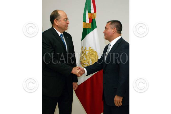 MÉXICO, D.F., 07DICIEMBRE2009.- Mpshe Yaalom, primer ministro adjunto de Israel, saluda a Genaro Garcia Luna, Secretario de Seguridad Publica Federal, después de una reunión que sostuvieron en el marco de colaboración internacional para el combate a la delincuencia que opera de manera trasnacional. FOTO: CUARTOSCURO.COM