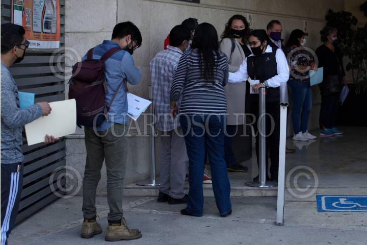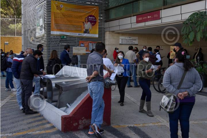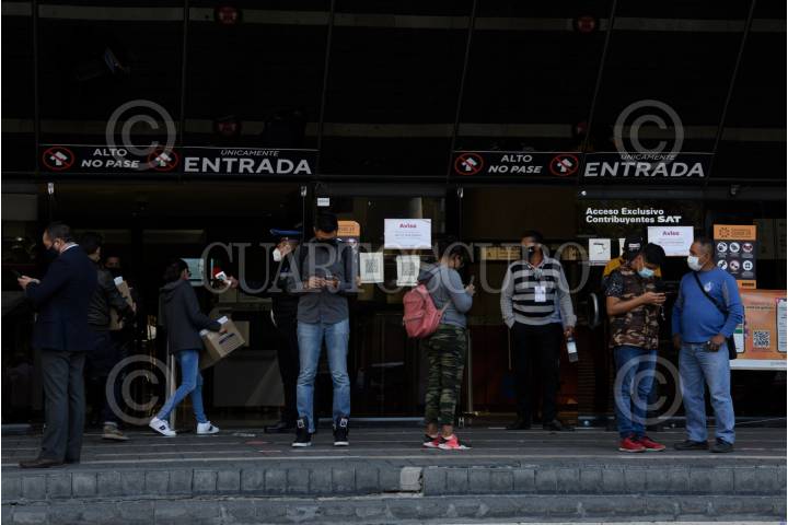 Personas esperan su turno en filas para poder realizar sus trámites ante el Servicio de Administración Tributaria (SAT) el cual amplió su horario de atención para agilizar la atención durante la pandemia por covid-19.