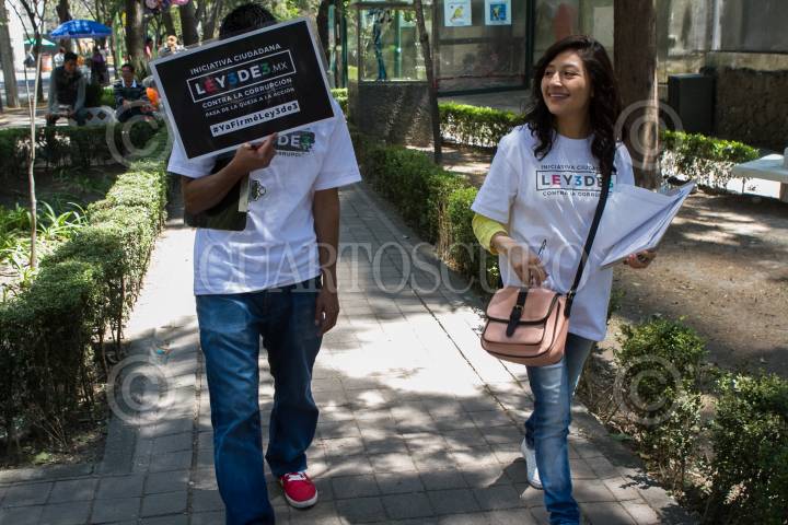 CIUDAD DE MÉXICO, 13MARZO2016.- Promotores de la Iniciativa Ciudadana Ley 3DE3, que busca que los funcionarios públicos hagan públicas tres declaraciones: declaración patrimonial, de intereses y fiscal. Además, define reglas claras de conducta para los servidores públicos y actores privados, así como sanciones para los corruptos, llevó a cabo una jornada nacional para buscar recolectar 120 mil firmas de ciudadanos, y que a través de este método se pueda promover dentro del congreso como una iniciativa de ley ciudadana. FOTO: MOISÉS PABLO /CUARTOSCURO.COM