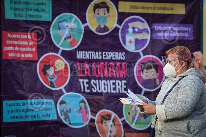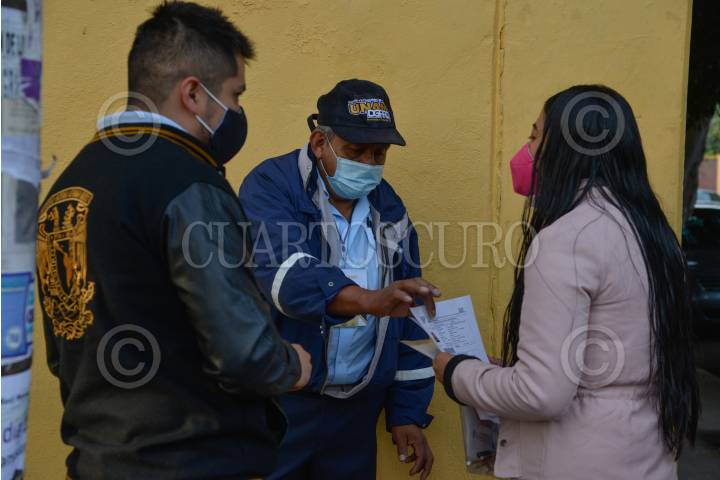Enfermera toma temperatura de un aspirante como medida protocaloria para presentar el examen a licenciatura.