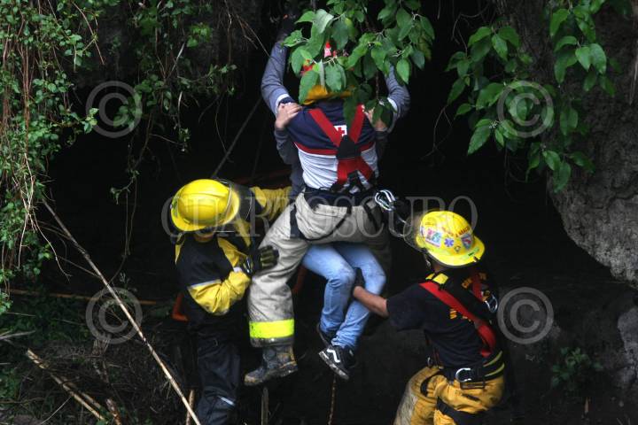 PUEBLA, PUEBLA, 12JULIO2011.- Tres adolecentes de entre 16 y 17 años, dos hombres y una mujer, quedaron atrapados en una caverna al aumentar la corriente de agua del río Atoyac provocado por las precipitaciones plúviales. Elementos de Protección Civil y el cuerpo de bomberos realizaron las labores de rescate en la que los menores resultaron ilesos. FOTO: FRANCISCO GUASCO/CUARTOSCURO.COM