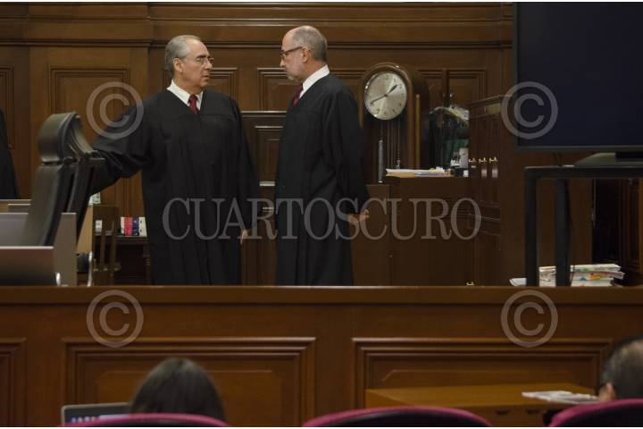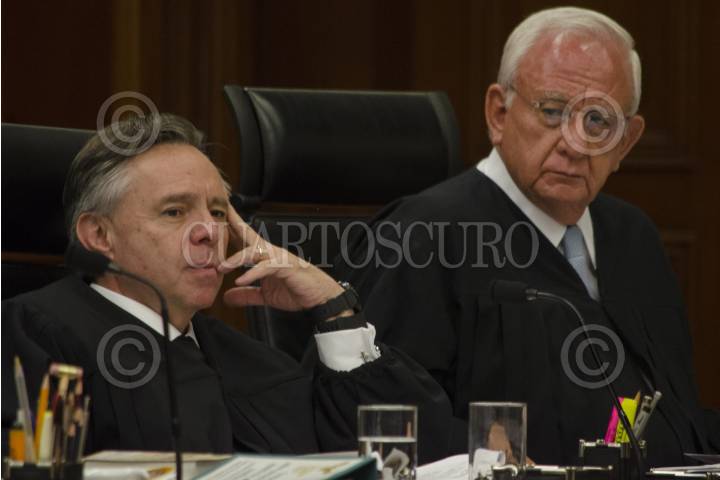 MÉXICO, D.F., 11AGOSTO2015.- Los ministros de la Suprema Corte de Justicia de la Nación continuaron la discusión en torno a la propuesta de proyecto para la legalización de adopción para parejas del mismo sexo en el estado de Campeche. A pesar de que existe una mayoría que respalda el proyecto, aun existen diferencias en materia de permitir la adopción bajo el argumento de que debe prevalecer el interés superior del menor. El proyecto surgió como propuesta de la ministra Margarita Luna Ramos, quien no asistió a la sesión de pleno este día. En la imagen, los ministros José Fernando Franco, y José Ramón Cossío Díaz. FOTO: MARÍA JOSÉ MARTÍNEZ /CUARTOSCURO.COM