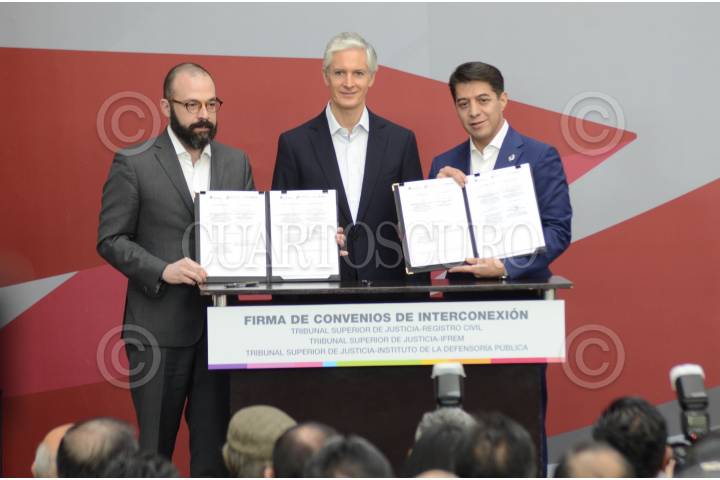 TOLUCA, ESTADO DE MÉXICO, 02OCTUBRE2018.- El Gobernador del Estado de México, Alfredo del Mazo Maza, acompañado por Sergio Medina Peñaloza, Presidente del Tribunal Superior de Justicia del Edomex, inauguraron el Juzgado Especializado en Adopciones, el primero en su tipo a nivel nacional y el Juzgado Familiar en Línea, y atestiguaron la firma de convenio entre el TSJEM y dependencias como el Registro Civil, el IFREM y el Instituto de la Defensoría Pública. FOTO: ARTEMIO GUERRA BAZ / CUARTOSCURO.COM