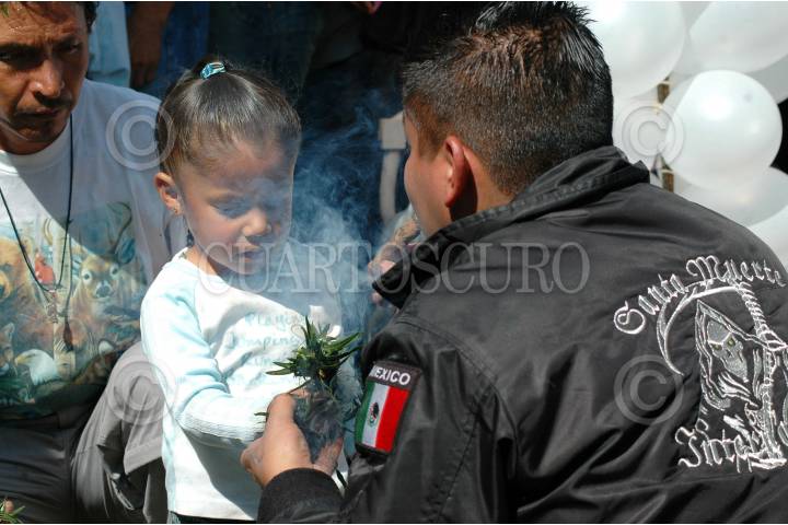 TULTITLAN, ESTADO DE MÉXICO, 27ENERO2008.- El Padrino Endoque Comandante Pantera oficio la misa ante decenas de fieles a la Santa Muerte en el santuario que se encuentra en Santa Maria Cuautepec en el municipio de Tultitlan. FOTO: RODOLFO ANGULO/CUARTOSCURO.COM