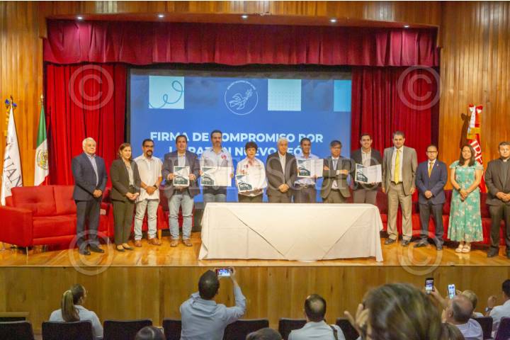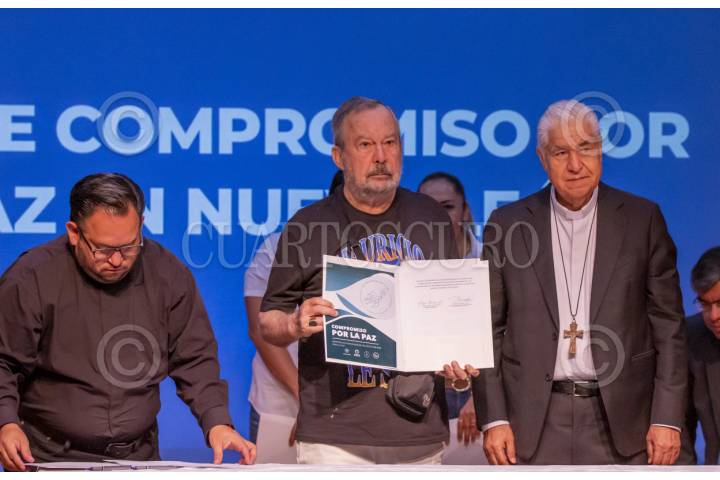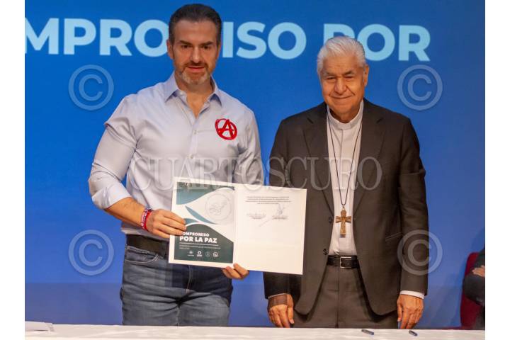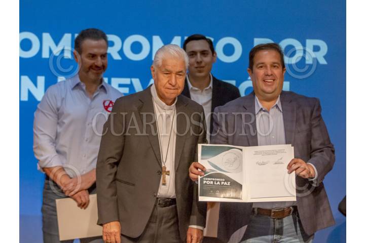 MONTERREY, NUEVO LEÓN, 17MAYO2024.- Los candidatos a las alcaldías por la Coalición Fuerza y Corazón por Nuevo León de Monterrey, San Pedro y Guadalupe: Adrián de la Garza, Mauricio Fernández y José Luis Garza Ochoa respectivamente, firman acuerdos de Paz con el Monseñor Rogelio Cabrera. FOTO: GABRIELA PÉREZ MONTIEL / CUARTOSCURO.COM