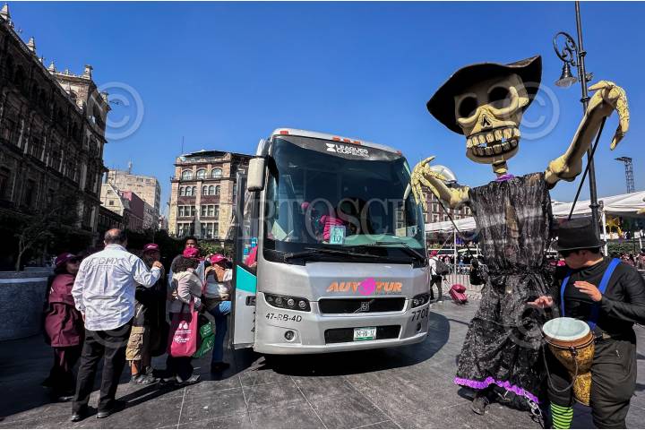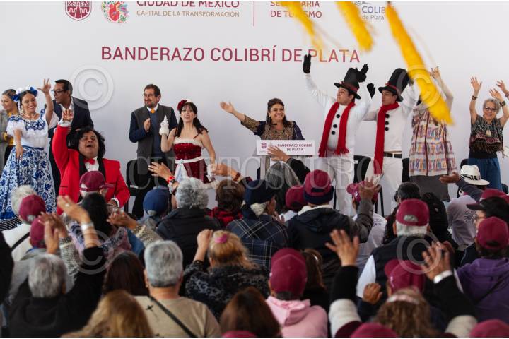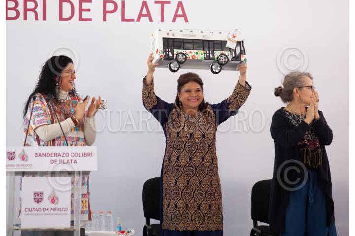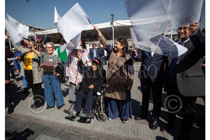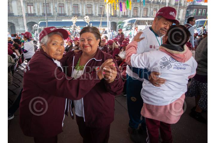 CIUDAD DE MÉXICO, 28NOVIEMBRE2024.- Clara Brugada, jefa de Gobierno de la Ciudad acompañada de Alejandra Frausto Guerrero, secretaria de turismo encabezaron el banderazo de salida de los camiones del programa Colibrí donde adultos mayores ganaron un viaje para ir a Acapulco. El evento se llevó a cabo en la plancha del Zócalo Capitalino. FOTO: ANDREA MURCIA /CUARTOSCURO.COM