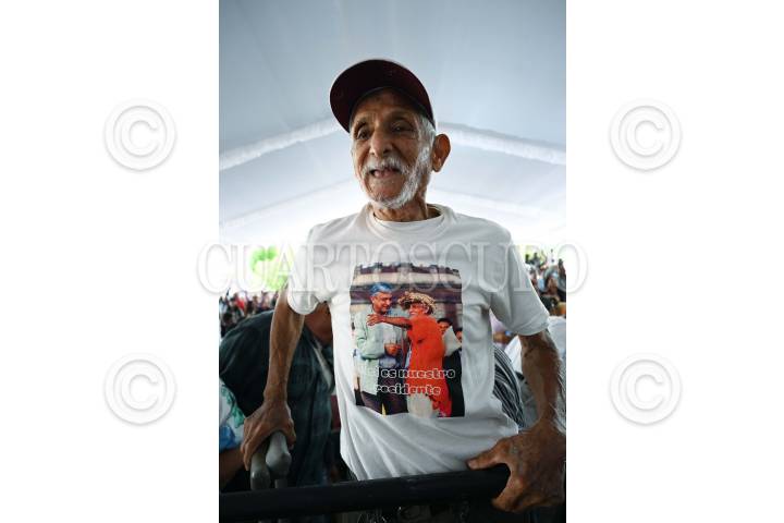 CAÑADAS DE OBREGÓN, JALISCO, 17AGOSTO024.- Un adulto mayor viste una playera en donde sale junto Andrés Manuel López Obrador, presidente de México, con la frase "El sí es nuestro presidente". Esto durante el evento protocolario del Plan de Justicia para los Pueblos de Temacapulín, Acasico y Palmarejo, en la plaza cívica de Temacapulín. FOTO: PRESIDENCIA/CUARTOSCURO.COM