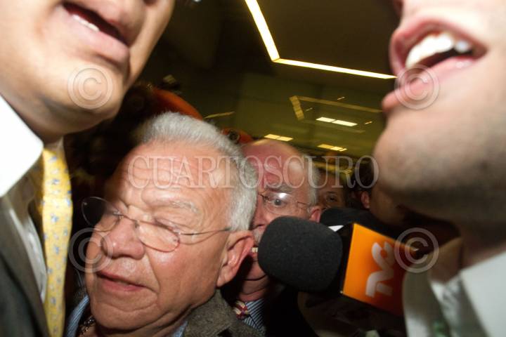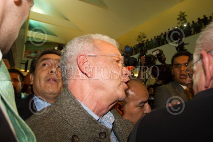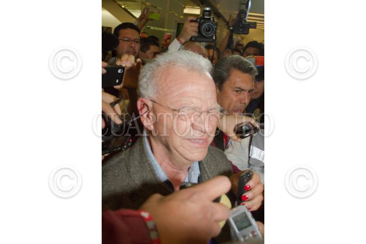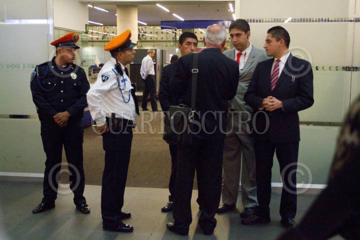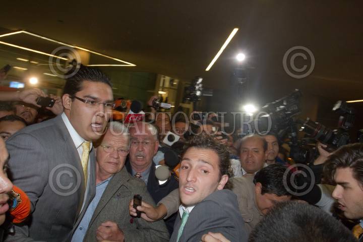 MÉXICO, D.F., 11JUNIO2013.-Luis Shotte, del despacho de abogados que lleva la defensa de Andrés Granier, exgobernador de Tabasco en el período 2007-2012 y acusado de un desvío millonario durante su administración, platica con la seguridad del Aereopuerto antes de su llegada. Posteriormente, enmedio de reporteros se abrió paso entre la prensa lo que ocasionó que se desmayara antes de llegar a su camioneta en la que fué transportado en una casa en esta Ciudad. FOTO: JUAN PABLO ZAMORA /CUARTOSCURO.COM
